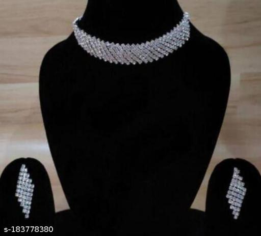 Beautiful-Silver-AD-Diamond-Choker-Set-With-Earrings-/-New-&-Trending-Necklace-Jewellery-Set-.-Western-AD---Stone-Jewellery-Necklace-/-Fancy-Stone-Silver-Choker-Jewellery