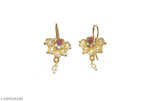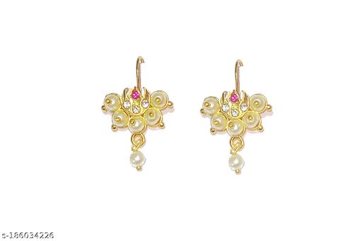 this pair of chandrakor bugdi earrings for women who wish to get that perfect Maharashtrian look. They are embedded with sparkling stone and made from golden finish metal. In addition these earrings has have droplets for added attraction.