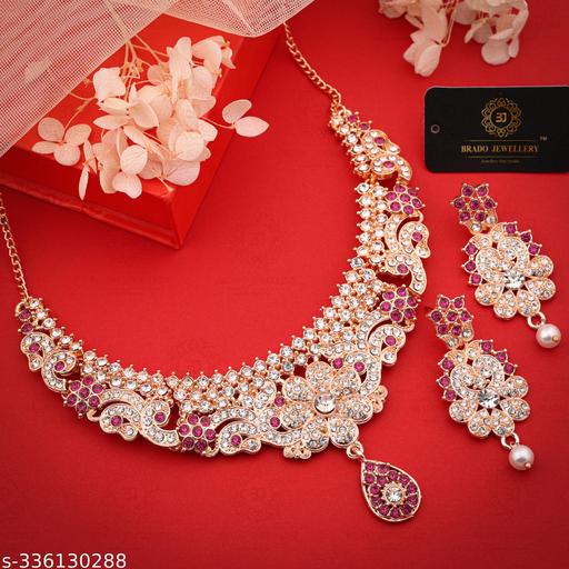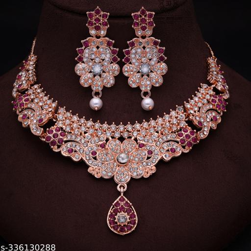 Exclusive Rose gold Necklace. Material Brass,American Diamond, Size : Free. You Can Adjust At Necklace Chain By Moving Hook, Necklace + 1 Pair of Earring, Very easy to use being lightweight and has a design which makes it very comfortable.They wear it on different occasion. They have special importance on ring ceremony,Party, wedding and festive time. This jewel set features a unique one of a kind traditional embellish with antic finish.Perfect gift : Ideal Valentine, Birthday, Anniversary gift your loved ones. Women love jewellery.