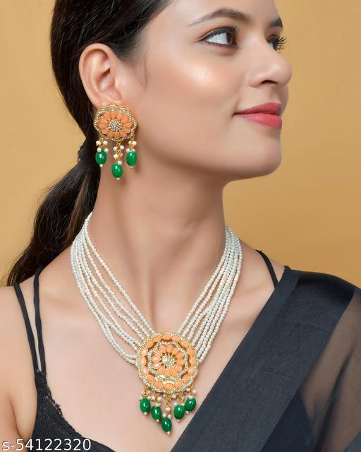 Alloy Plating: Gold Plated Stone Type: Kundan Sizing: Adjustable Type: Necklace and Earrings Multipack: 1 This bridal wedding party wear choker neckless Jewellery set for girls and women is made of Kundan which looks stylish and goes perfect with any attire. This latest design kundans jewellery set for women is perfectly suited for bridal wedding or party wear. Styyo is a well known brand across fashion jewellery sector. Styyo has huge collection of latest statement necklace jewellery, traditional necklace set, pendant set and other jewellery accessories which includes fancy bangles for women, wedding bangles, ear cuffs, traditional bangles kada, neck choker, fashion party wear necklace for girls and jhumki jhumka earrings. Styyo is pioneer of Imitation jewellery and designer pearl necklace set for women and American diamond hangings fancy party wear stylish Earrings. Styyo Fashion and Traditional jewellery give true value for your money. These are also ideal for birthday gifts for girls, love valentine gifts for girlfriend, wedding gifts and anniversary gifts. Country of Origin: India Share Text: Catalog Name:*Shimmering Chic Jewellery Sets* Base Metal: Alloy Plating: Gold Plated Stone Type: Kundan Sizing: Adjustable Type: Necklace and Earrings Multipack: 1 Easy Returns Available In Case Of Any Issue