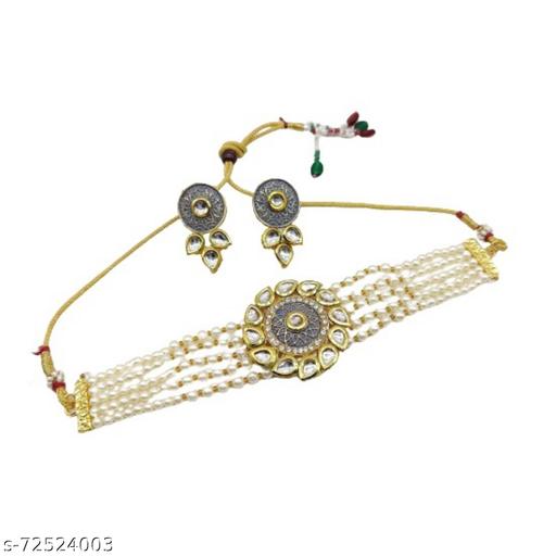 Grey Kundan Pearl Choker Necklace Set for Women is made of Alloy. Women love jewellery; specially traditional jewellery adore a women. They have special importance on wedding and festive time. They can also wear it on regular basics. This set features a unique one of a kind traditional embellish with antic finish.