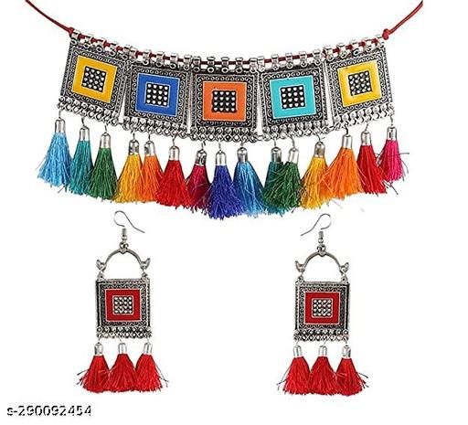 Jewellery Set for Women Oxidized Silver color Oxidised Tribal Cotton Thread Jewellery Set for Women & Girls New Jewel Oxidised Jewellery Afghani Style Necklace Set for Women & Girls - Black Jewellery Set : Multi-Colour Material: Oxidised Silver Quality: Handcrafted pair of necklace with earrings. Gives modern and Western look.