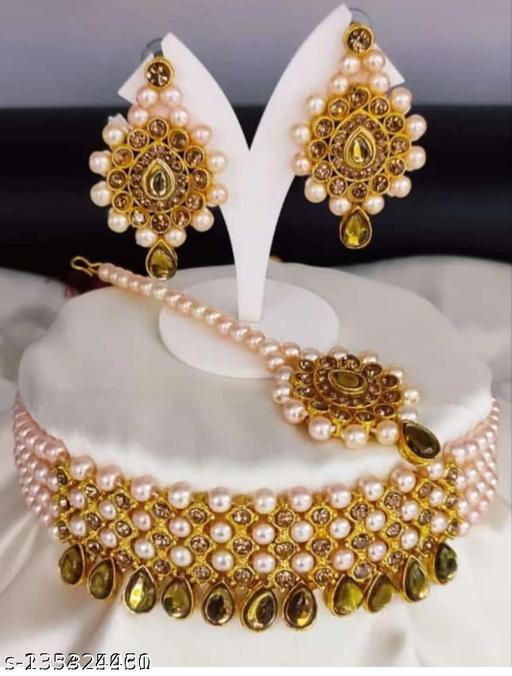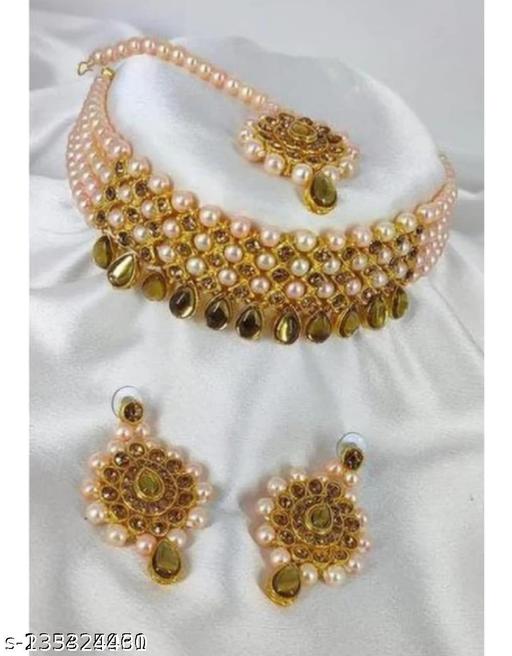 Name: jewellery setTraditional Stylish Ethnic & Party Wear Multi-Stone & Pearl Beaded Choker Necklace set with Maang Tikka & Earrings (BJ 110 GOLD