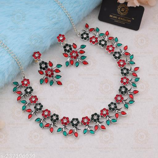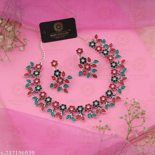 Krishna Jewellery Pack Of 1 Silver Plated Oxidised White American Diamond And Heavy Polished Diomond Choker Necklace Set With 1Pair Of Earrings