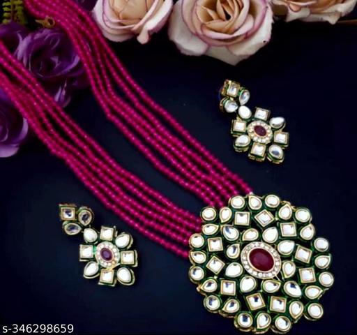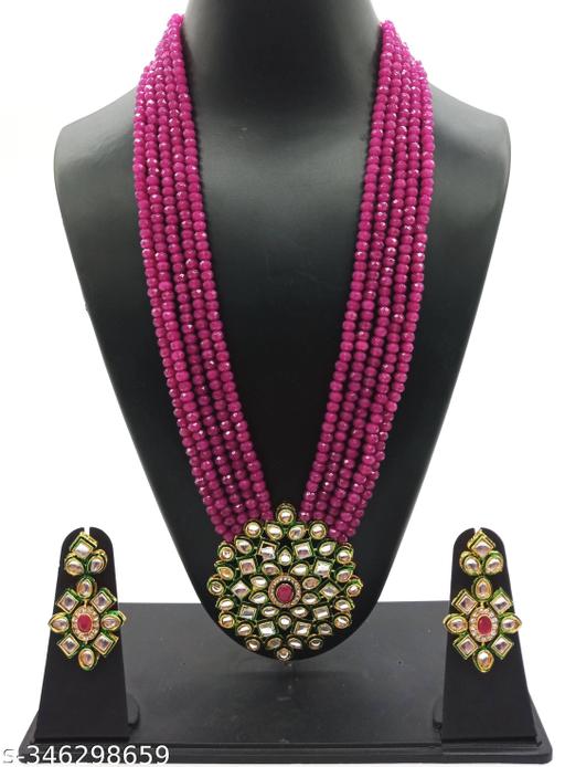 1. Beads Gold Plated Necklace Set: A beautiful set consisting of a long necklace and drop earrings, adorned with beads and gold plating for a classic touch.