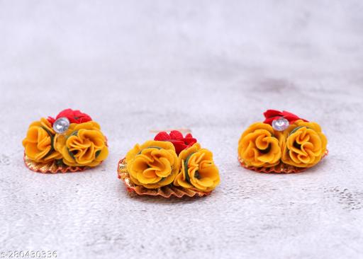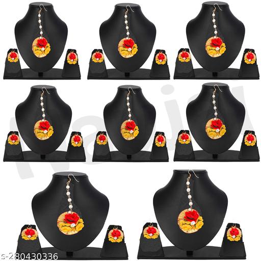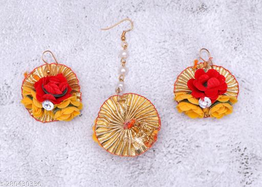 Name: Navjai Latest Ethnics Flower Maang tikka & Earring Set for Wedding Baby Shower Haldi & Mehandi Women's Gota Patti Red & yellow Flower Maang Tikka (Combo Set of 8)