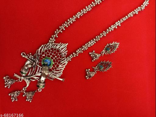 Name: Oxidised German Silver Jewellery Set/Krishna Flute Jewellery Set/Sterling Silver Plated Alloy Necklace Set/Black Silver Plated Metal Necklace For Girls And Women