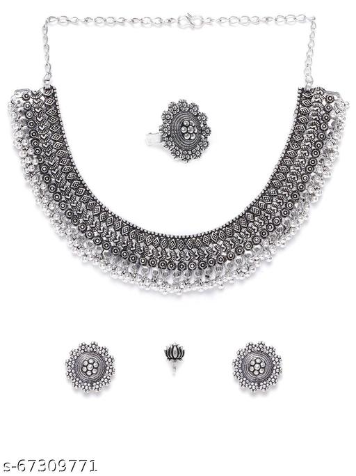 1)Modern, yet Ethnic Looks- Genuine German Oxidized Silver Representing a classic fusion of exquisite craftsmanship and feminine elegance, the Classic Beauty is lot more for impression.Designer crafted choker Necklace set with earrings ring nose pin which is stylish contemporary Fringe Celebrity Style.Fabulous match for traditional outfits of all kinds.2)Produced under Quality Control; One by One Checking; Focus on Detail Processing. Top Quality/ Latest Trend Design/Anti-Allergy.3)Beautiful Looks at One Glance- with Intricate High Polish creates Glamorous Reflections and adds Luxurious Looks. Necklace Charm length- 24 cm Necklace Hight - 48 CM Including Adjustable ,Width -3 CM,Earrings Size -2.8 cm * 2.8 cm. Ring Size - Adjustable 5)Gift for Women - Ideal Valentine, Birthday, Anniversary gift for someone you ? LOVE ?. With our packaging Box, you do not need to opt-in for any additional gift packaging. The product comes in a beautiful Elegant Ready-to-Gift Box. "