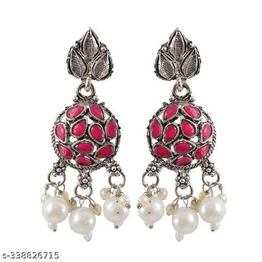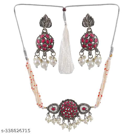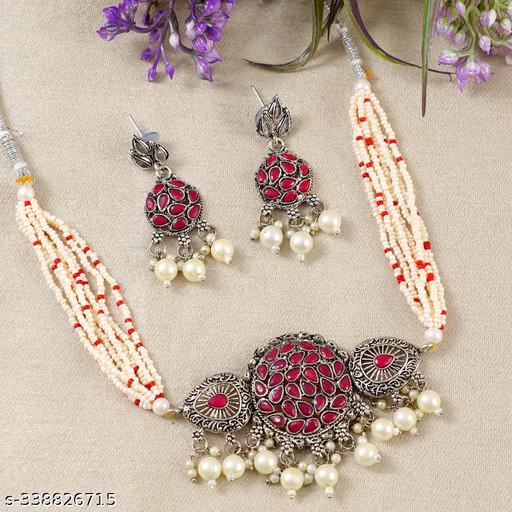 Name: Oxidised Silver Pink Stone Multistrand Pearl-Beaded Jewellery Set