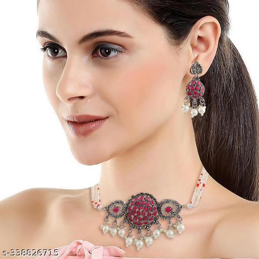 Indulge in the mesmerizing allure of our Oxidized Silver Pink Stone Multistrand Pearl-Beaded Jewellery Set, a masterpiece that seamlessly blends tradition with contemporary elegance. This set is a symphony of oxidized silver, delicate pink stones, and lustrous pearl beads.