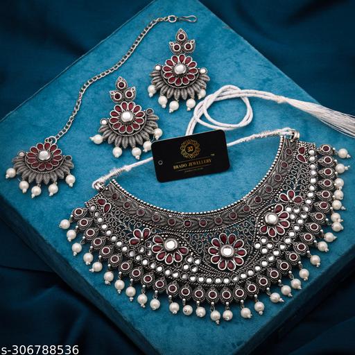 About Product :- Colour : White,Maroon and Silver, Material : Brass, Plating : Silver Plated.In The Box :- Pack of 1 Oxidised Silver Plated White Kundan worked and Maroon stone Jewellery Set Necklace + 1 Pair of Earrings + 1 Maang Tikka.Dimension :- Necklace Length - 20.32 cm, Necklace Width - 15.24 cm| Earring Length - 5.08 cm, Earring Width - 2.54 cm.Material : Made With Pure Brass.This jewellery set consists of a necklace and a pair of earrings. Oxidised Silver-Plated Necklace, has AD studded detail.A pair of matching Drop Earrings, each secured with a Post and Back Closure.PRATIXA ENTERPRISE is a celebration of womanhood, a celebration of the life of a confident, down to earth woman who is here in today’s modern world with traditional sensibilities and a whole lot to give and share.PRATIXA ENTERPRISE brings the best, exquisite design jewelry to you at affordable prices. Our expert eye for craftsmanship, rarity, and quality can be seen through all of our flattering designs. This breathtaking necklace with earrings jewelry set is great for making a fashion statement. It will bring you a lot of compliments. Traditional necklaces add a hint of raw ethnic beauty to any look. Representing a classic fusion of exquisite craftsmanship and feminine elegance, this set will definitely be a treasured inclusion in every woman's jewelry collection. Best gifts for mother, sister, wife, and