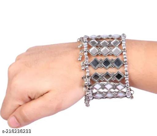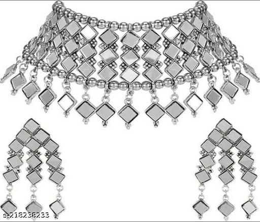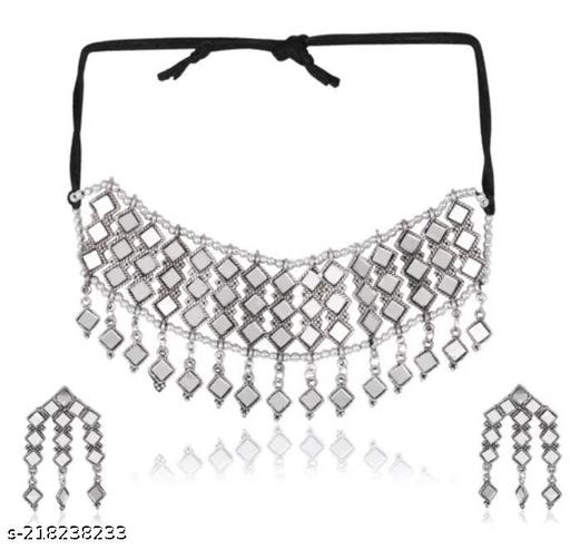 Name: Renuka Jewels. Afghani Style Silver Oxidised Mirror Choker Necklace Set with Bracelet for Women & Girls
