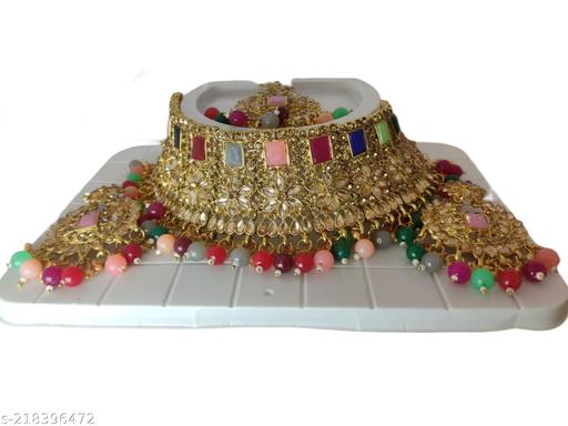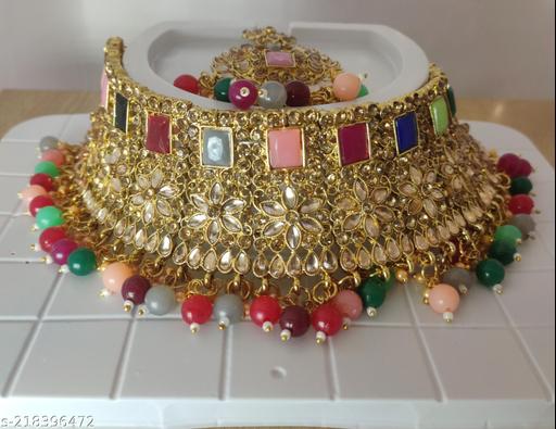 Name: RK Jewels Adorable Cluster Drops Kundan Choker Necklace, Earring, Maangtika Set for Women