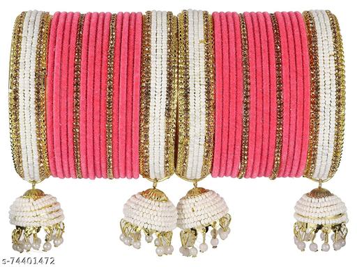 Name: SAB Non-Precious Metal Studded with Zircon Gemstone or Pearls and Velvet worked Glossy Finished Latkan Chuda/Bangles Set For Women and Girls,(Watermelon), Pack of 32 Bangle