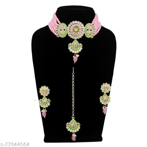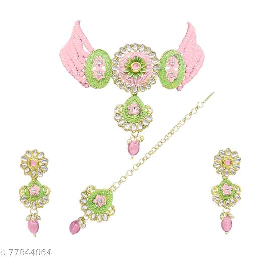 Name: SAIYONI Gold Plated Meenakari Work Round Shape Pendant With Kundan Stone Beaded Choker Necklace Earring With Maangtikka Jewellery Set