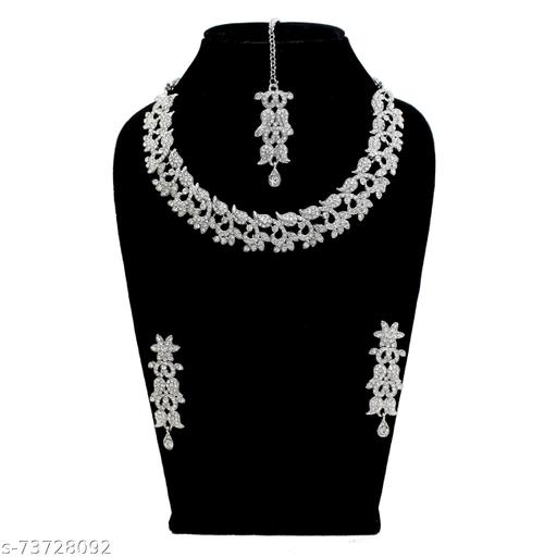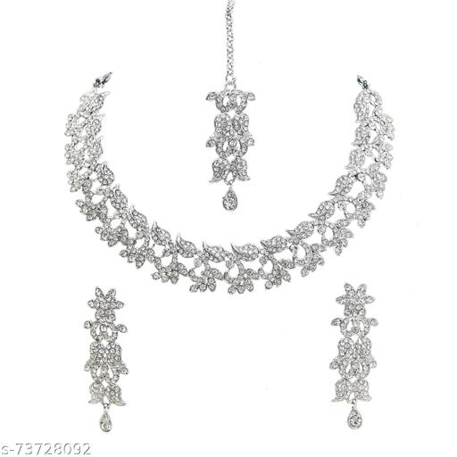 Complete your beautiful looks with this Austrian Diamond Choker Necklace Set and get an overall gorgeous appearance. Wear it on special occasions and everyone with your looks. This necklace set is a perfect combination of traditional & contemporary design. Suitable for all Kinds of Dressy Occasions. Jewelry adds Lavishing look to any clothing. Any fabulous outfit is incomplete without matching jewelry.Traditional Austrian Diamond Rhodium Plated Choker Jewellery Sets for Women will complement any Indian attire. Women Love Jewelry as it not only enhances their beauty, but also gives them the social confidence. Make your moment memorable with this range. This jewel set features a unique one of a kind traditional embellish with antic finish. Earrings are very easy to use being lightweight and has a design which makes it very comfortable.This jewelry set comes with a mang tikka and is an ideal match for a wedding. This mang tikka is a perfect match for this wedding set and will make you look your best on any occasion.Contains : 1 Necklace + 1 Pair of Earring +1 Maangtikka. product Dimension : Necklace Length -21 cm| Necklace Width - 2 cm| Earring Length - 6.5 cm| Earring Width -2 cm. Maangtikka Length - 15.5 cm| Maangtikka Width - 2 cm.