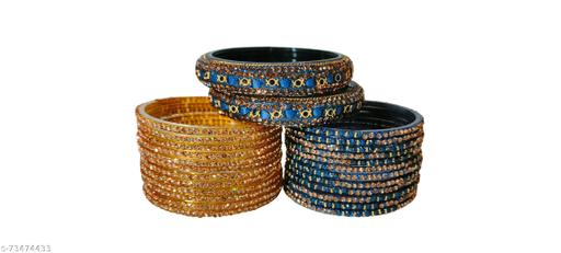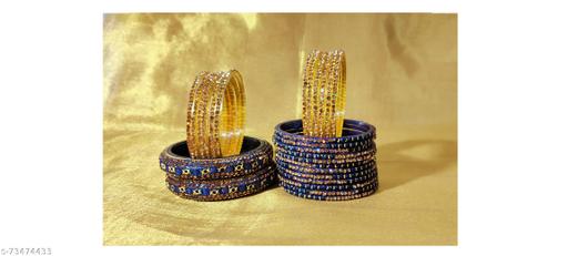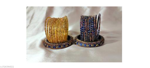 Name: SET OF 2 BLUE GLASS KADA WITH 12 GOLDEN STONE GLASS BANGLES & 12 BLUE GLASS BANGLES