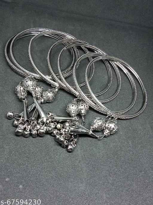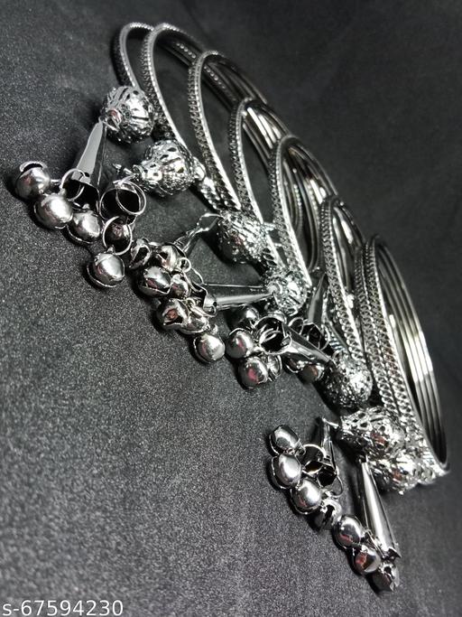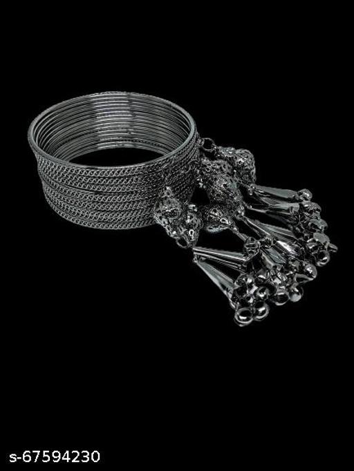 Name: Shivarth Oxidized Silver Bangles Latkan with Gungroo Tassels Charms linked Chain Latest Trend Afghani Bangle Set Kade Bracelet Black,Golden & Silver Colour Chudi for Girls and Women ( Pack of 8pcs )