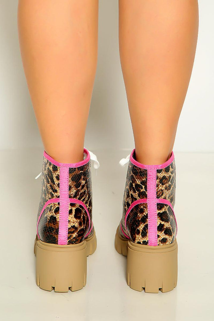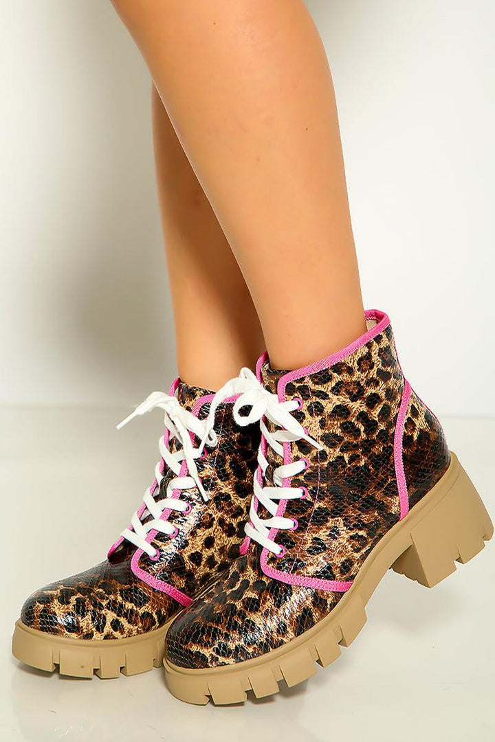 These super cute boots are perfect for any day or even hiking! Featuring; a round toe paired with a closed back, lace up front and pink trim details, leopard print, chunky lug sole and chunky heel, followed by a lightly cushioned foot bed.