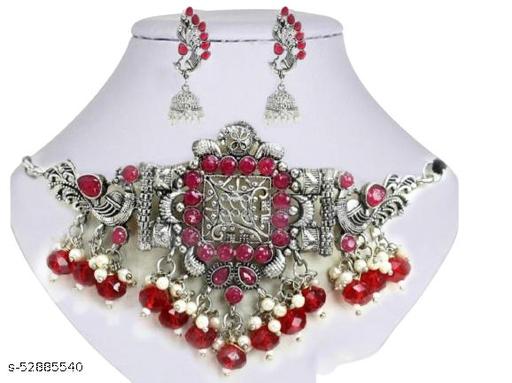 Name: SHREYA-FASHION-Silver Oxidized Red Silver Peacock Choker Necklace Earring Set for women and girls' (Red-Silver)