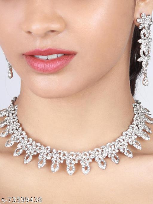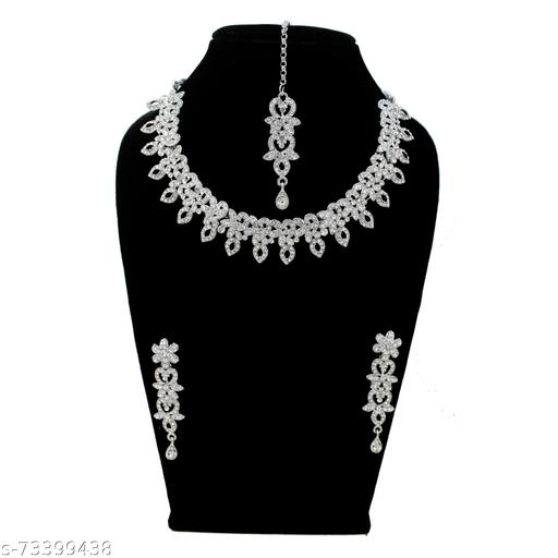 Complete your beautiful looks with this Austrian Diamond Choker Necklace Set and get an overall gorgeous appearance. Wear it on special occasions and everyone with your looks. This necklace set is a perfect combination of traditional & contemporary design. Suitable for all Kinds of Dressy Occasions. Jewelry adds Lavishing look to any clothing. Any fabulous outfit is incomplete without matching jewelry.Traditional Austrian Diamond Rhodium Plated Choker Jewellery Sets for Women will complement any Indian attire. Women Love Jewelry as it not only enhances their beauty, but also gives them the social confidence. Make your moment memorable with this range. This jewel set features a unique one of a kind traditional embellish with antic finish. Earrings are very easy to use being lightweight and has a design which makes it very comfortable.This jewelry set comes with a mang tikka and is an ideal match for a wedding. This mang tikka is a perfect match for this wedding set and will make you look your best on any occasion.Contains : 1 Necklace + 1 Pair of Earring +1 Maangtikka. product Dimension : Necklace Length -22 cm| Necklace Width - 2.5 cm| Earring Length - 6 cm| Earring Width -2 cm. Maangtikka Length - 16 cm| Maangtikka Width - 2 cm.