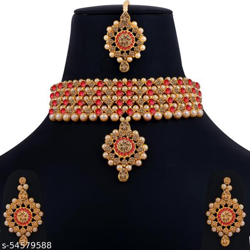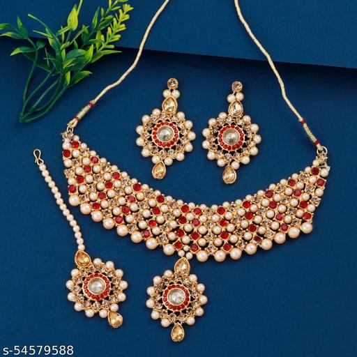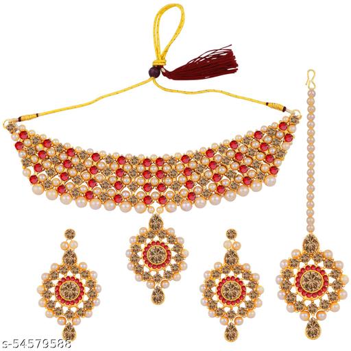 Silver Shine Introducing Gold Plated choker set for women is made of alloy . Self Textured Stone Kundan, Diamond, Pearl Designer Bridal Wedding Necklace Choker jewellery set for Girls And Women .This jewellery set can be wear it on different occasion,that can be adore a Women or Girl.Necklace is secured with an adjustable draw string closure.A pair of matching jumkhas,secured with post-and-back closure.A maang tikka is secured with a hook closure. Stay Stylist And Keep Shinning With jewellery. *There might be minor color variation between actual product and image shown on screen due to lighting on the photography. Contains : 1 Necklace,1 Pair Of Earring And 1 Maangtikka / Dimension - Necklace- L -4 cm, Width 19 cm/ Pendant- L-6cm,W-3cm / Earring - L -7 cm, Width - 4 cm, Maang tikka- L-13 cm,Width-4 cm