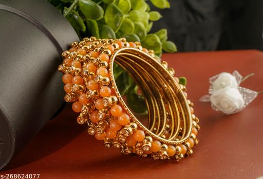 Add elegance to your outfit with these Pearl Moti Diamond Stone Studded 4-Piece Bangles. Each bangle is carefully crafted with diamond stones that are set in a beautiful pearl motif. The intricate detailing on these bangles makes them the perfect accessory for any special occasion or event. Whether it's a wedding, party, or formal gathering, these bangles are sure to make you stand out in the crowd. The set includes four bangles, allowing you to mix and match to create your own unique look.