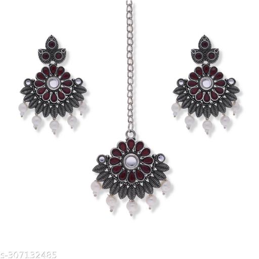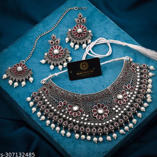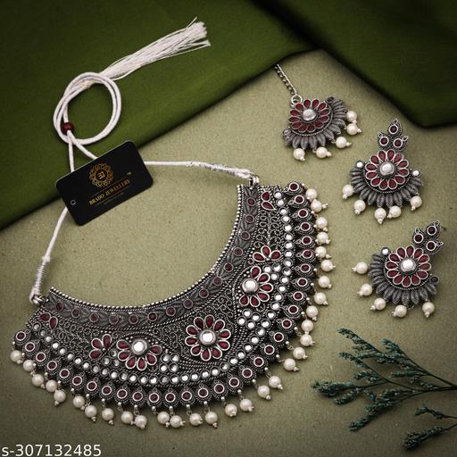 About Product :- Colour : White,Maroon and Silver, Material : Brass, Plating : Silver Plated.In The Box :- Pack of 1 Oxidised Silver Plated White Kundan worked and Maroon stone Jewellery Set Necklace + 1 Pair of Earrings + 1 Maang Tikka.Dimension :- Necklace Length - 20.32 cm, Necklace Width - 15.24 cm| Earring Length - 5.08 cm, Earring Width - 2.54 cm.Material : Made With Pure Brass.This jewellery set consists of a necklace and a pair of earrings. Oxidised Silver-Plated Necklace, has AD studded detail.A pair of matching Drop Earrings, each secured with a Post and Back Closure.VORA FASHION is a celebration of womanhood, a celebration of the life of a confident, down to earth woman who is here in today’s modern world with traditional sensibilities and a whole lot to give and share.VORA FASHION brings the best, exquisite design jewelry to you at affordable prices. Our expert eye for craftsmanship, rarity, and quality can be seen through all of our flattering designs. This breathtaking necklace with earrings jewelry set is great for making a fashion statement. It will bring you a lot of compliments. Traditional necklaces add a hint of raw ethnic beauty to any look. Representing a classic fusion of exquisite craftsmanship and feminine elegance, this set will definitely be a treasured inclusion in every woman's jewelry collection. Best gifts for mother, sister, wife, and girlfriend.